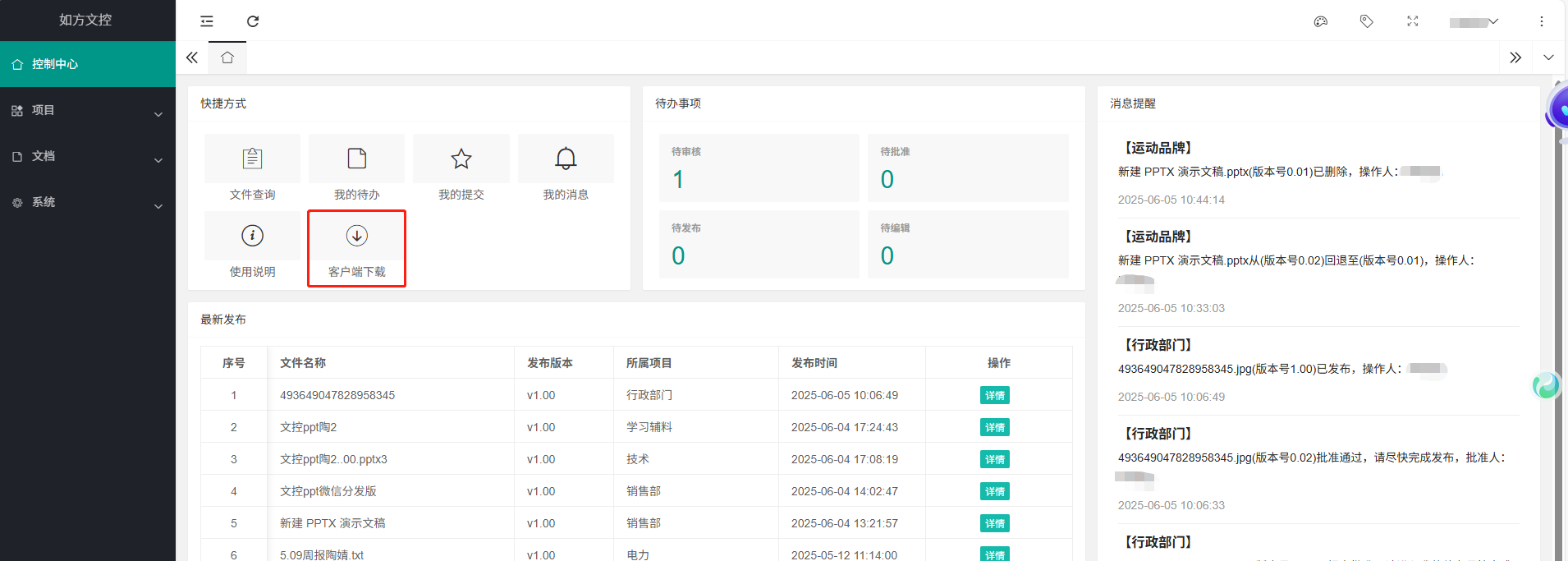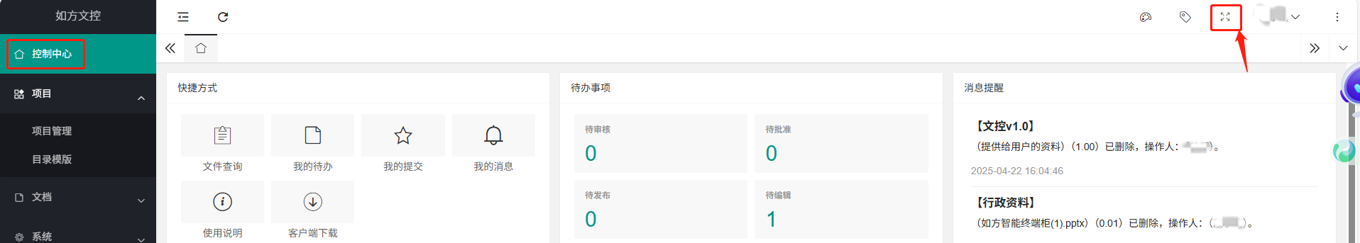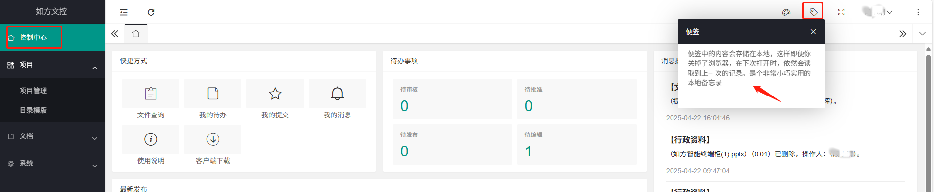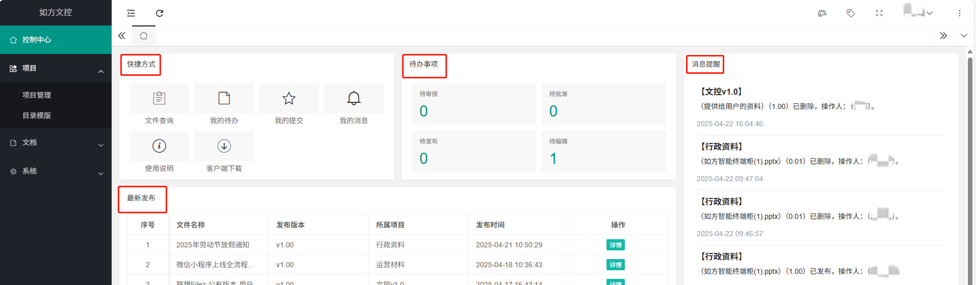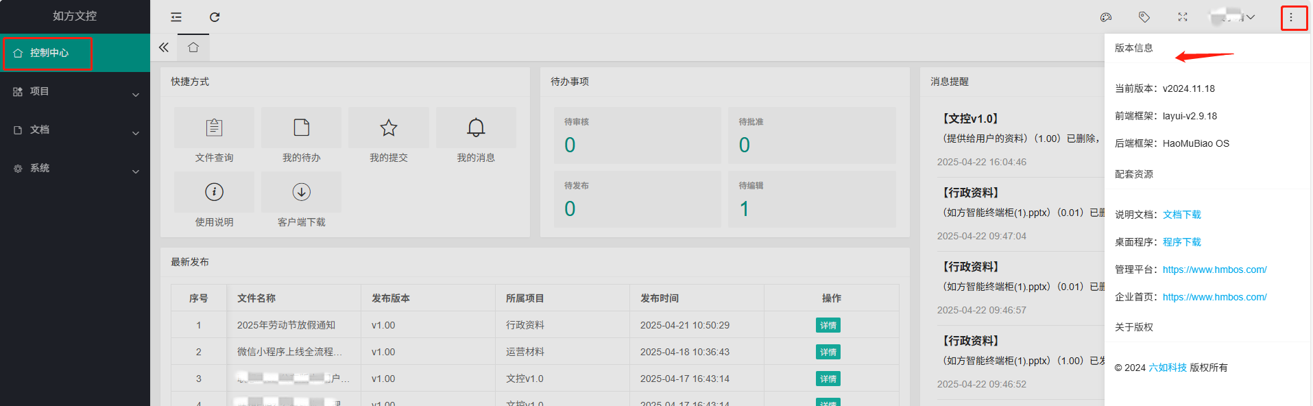 在控制中心界面可以看到一些快捷方式、待办事项、消息提醒、最新发布。