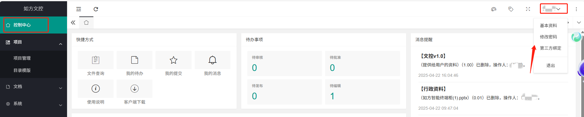在登录完成后,进入到控制中心即文控的首页界面,右侧点击姓名可修改自己的基本资料信息、修改密码、 第三方绑定、退出操作。
